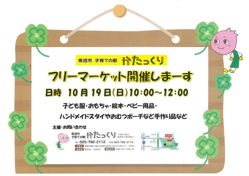 10/19(日)フリーマーケットのご案内 2025年10月7日 フリーマーケット開催です 10月19日(日)10時~12時 かたっくり1階団体活動スペースにて行います 子ども服・ベビー用品・おもちゃ、ハンドメイドスタイや手作り親子グッズなど 出店予定 一覧に戻る