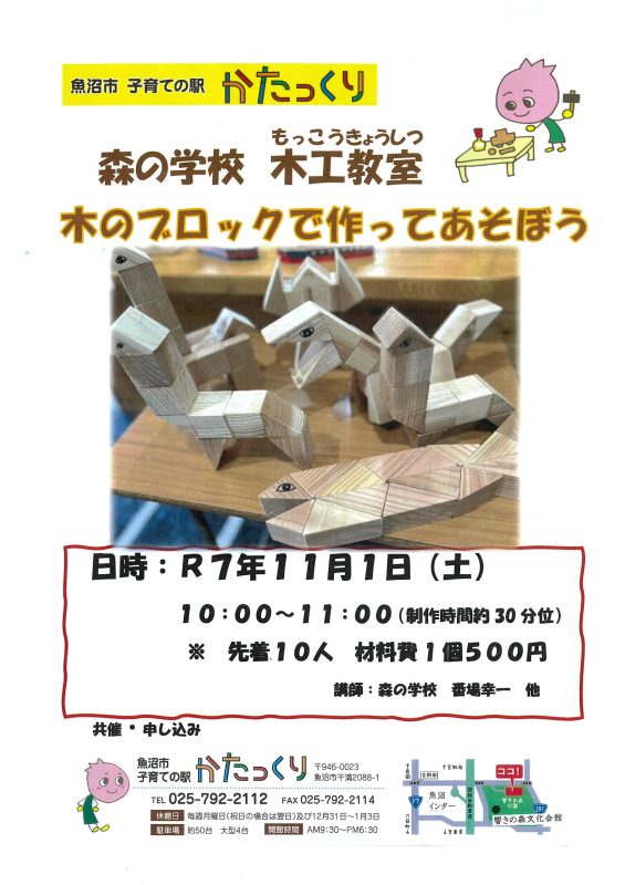 (終了)11/1(土)木工教室「木のブロックで作って遊ぼう」 2025年10月26日 開催日時 11月1日(土)10時~11時 (制作時間30分程度) 予定数 先着10人 材料費 1個 500円 講師 番場幸一さん他 森の学校の皆さん チラシ 251101木工教室「木のブロック」 一覧に戻る