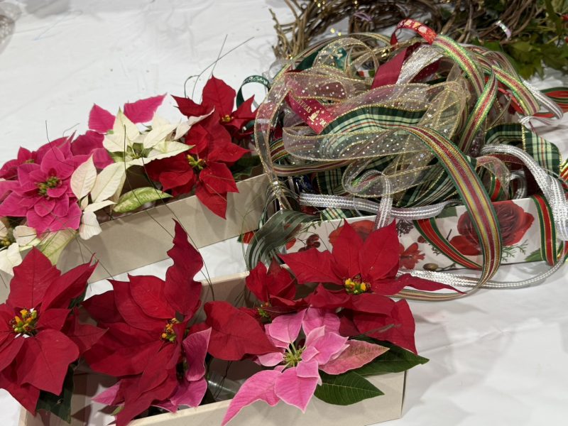 生のポインセチアをつけて完成です。