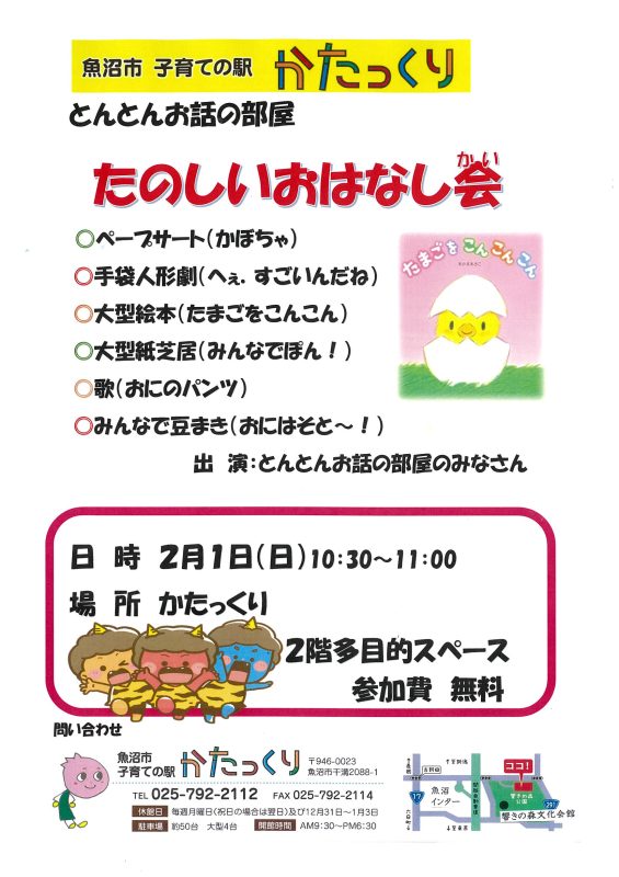 2/1(日)とんとんお話しの部屋 たのしいおはなし会 2026年1月4日 開催日時 2月1日(日)10時30分~11時 場所 2階多目的スペース(和室) 参加費 無料 内容詳細 大型絵本・大型紙芝居・手袋人形劇・他 チラシ とんとんお話し会 一覧に戻る