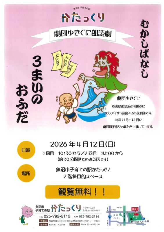 【開催日】2026.4/12(日)劇団ゆきぐに朗読劇「3枚のおふだ」 2026年3月21日 開催日時 4月12日(日) ①10時30分~ ②14時00分~ 約30分間ほどのお芝居です 場所 2階多目的スペース(和室) 参加費 無料 内容詳細 劇団ゆきぐに団員による朗読劇です お話しの中の登場人物をそれぞれの団員が語りでお芝居します。 チラシ 三枚のおふだ 一覧に戻る